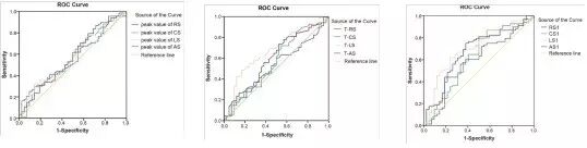 本研究中所做ROC曲线主要分为三部分:①所有应变峰值的ROC曲线;②所有应变达峰时间的ROC曲线;③各应变峰值和达峰时间组合的复合指标的ROC曲线。计算每个指标对应的曲线下面积。具体结果如下:通过上述ROC曲线和曲线下面积(可得出各应变峰值在冠心病诊断中均无统计学意义(P>O.05);各应变达峰时间中仅纵向应变达峰时间(T—LS)在冠心病中诊断具有统计学意义(P:O.003),曲线下面积(AUC)为0.667;而对于复合指标,对冠心病诊断的敏感性明显高于峰值或达峰时间单个指标,CS复合指标的AUC为0.621(P:O.034),LS复合指标的AUC为0.692(P:O.001),ASl的AUC为0.672(P=O.672)。3D-STE对诊断冠心病有统计学意义的各指标的诊断价值依次为:LSl>ASl>T—LS>CSl。LSl的诊断价值最高。